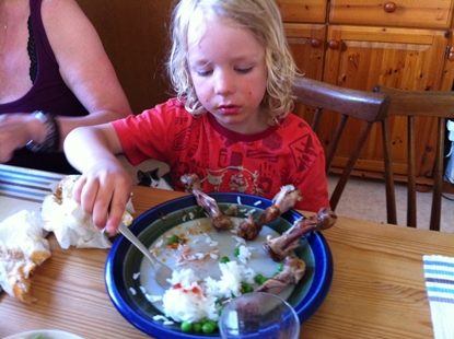 Sedan bar det av för att äta mat. Ossian åt sex lycklingklubbor.