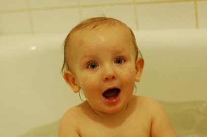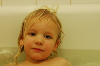 Han gillar att bada precis som sina bröder. Han är inte fullt så vild som jetmotorn Ossian är på simskolan, men i badkaret brukar han se till att plaska ordentligt.