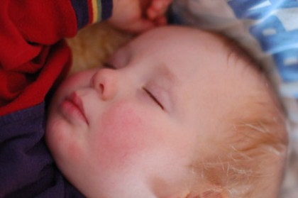 Så här fint sover han på morgonen i soffan efter ett par aktiva timmar. Lite suddig blev han på bilden för det var mörkt i rummet.