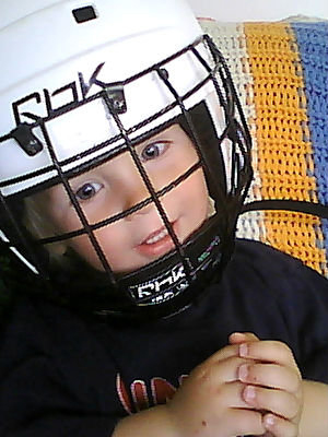 Nu på morgonen har han poserat vid webkameran i sin nya hjälm som han fick ärva igårkväll. Idag ska han åka till Cloetta Center och inviga den. I båset ::mrgreen: Han kan nog inte föreställa sig en bättre födelsedag. ‘Mina hickåå!’ springer han runt och ropar här hemma med Ossians skridskor i famnen (och nu har han även fått på dem på fötterna och går omkring!!). Tyvärr är de ju inte hans.