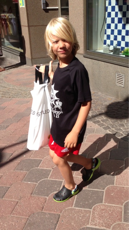 Sedan tog vi en runda i hamnen och en sväng på stan. Ossian fick sitt andra par foppisar för denna säsong. Har lärt att riktiga Crocs inte är så dumt ändå.. men lever inte som jag lär.