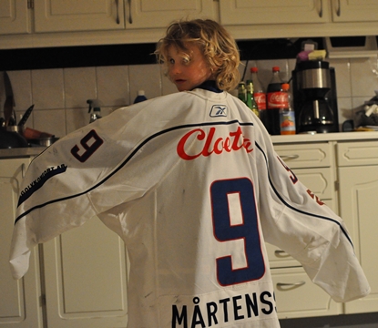 Wilmer provar den äkta och signerade Tony-tröjan som ska lottas ut på Team Sportia Cup i morgon.