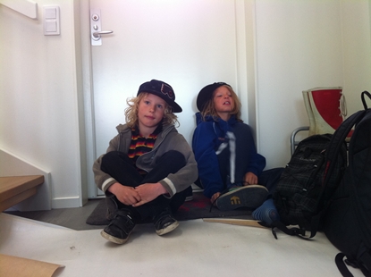 Anton och Wilmer sitter på byggpappret innan avfärd till skolan