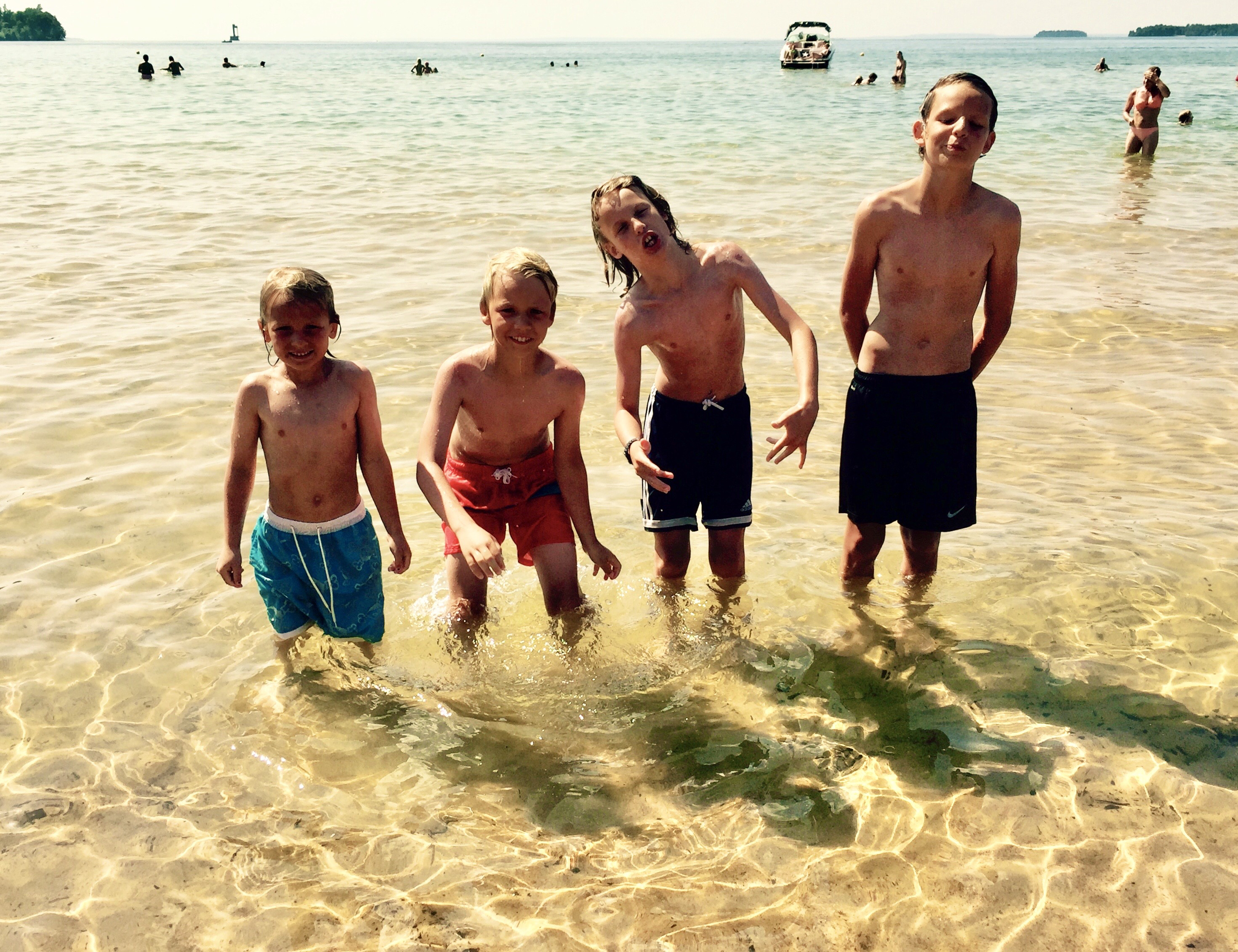 Han är där inne. Hon ser honom först. Han har en blå t-shirt på sig med bokstäver i olika färger på magen och bröstet. Hon har inte sett den förut. De har ju å andra sidan inte träffats så många gånger heller.