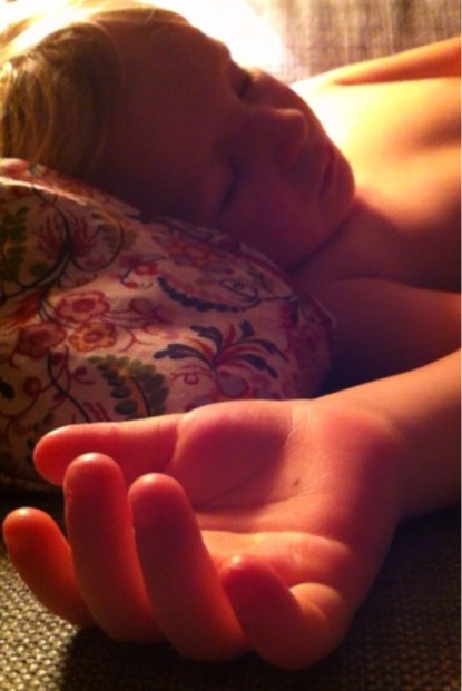 Ossian sover hos mormor och morfar. Han var ledsen och arg på förmiddagen och vi var tvungna att hitta på något för att han skulle bli gladare. Nu är han glad. Då är jag också nöjd.